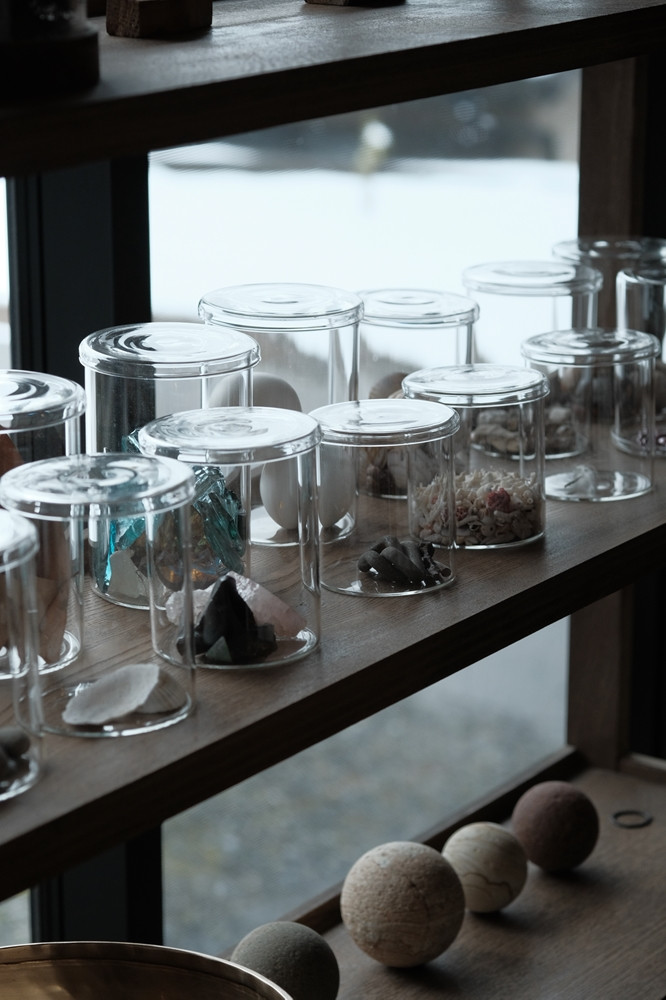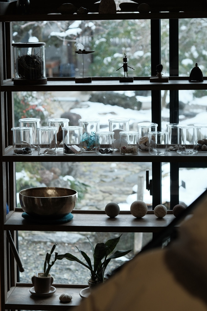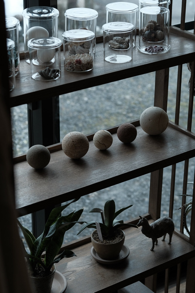 渡邊さんの趣味が集められた窓際の棚。鉱物、動物の小さな骨片、貝殻、実験中だという赤銅色の金属の珠など。