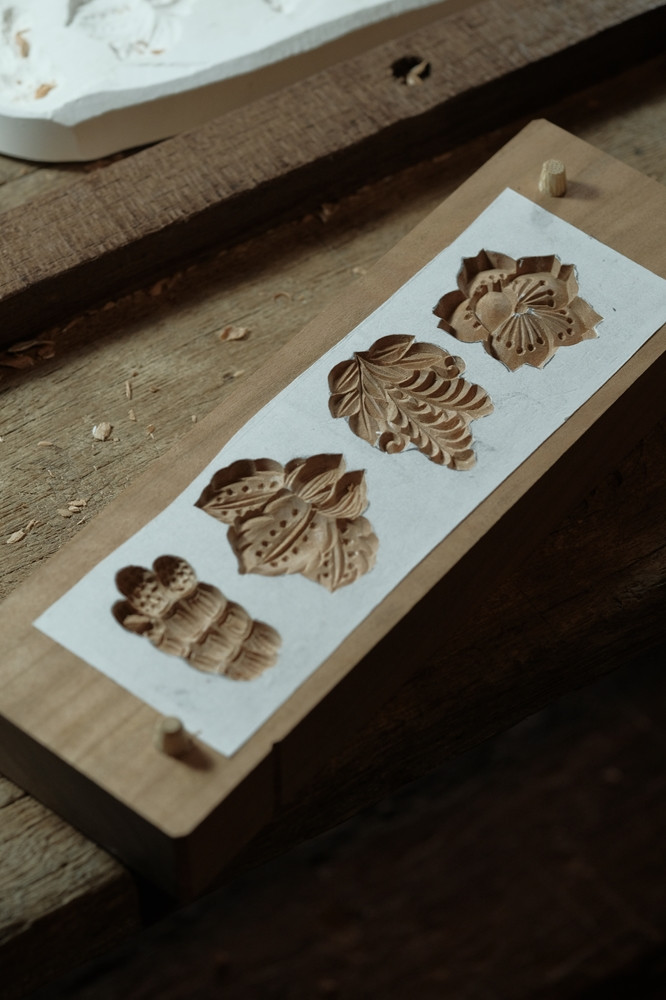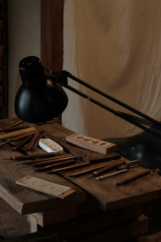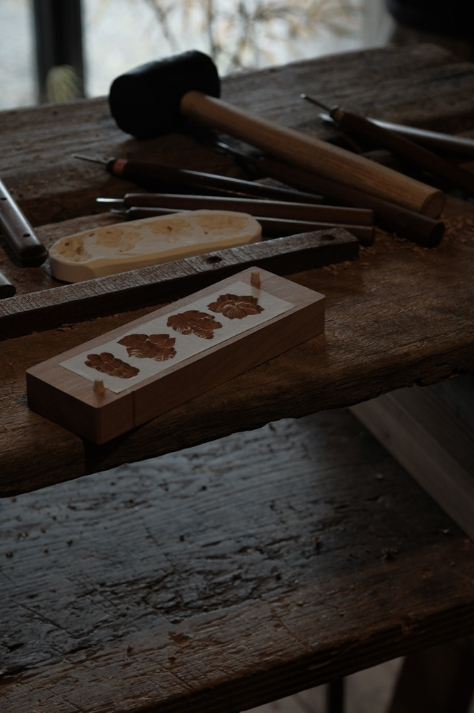 彫刻作品づくりと並行し菓子型の制作もされており、作業机の上には作りかけのものがあった。精緻な仕事ぶりだった。