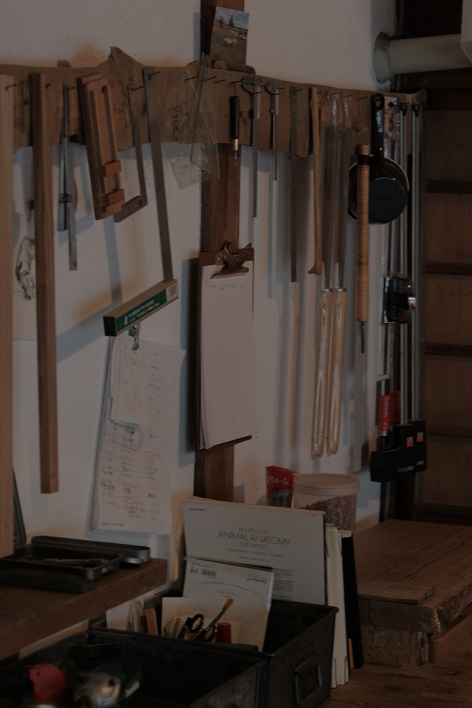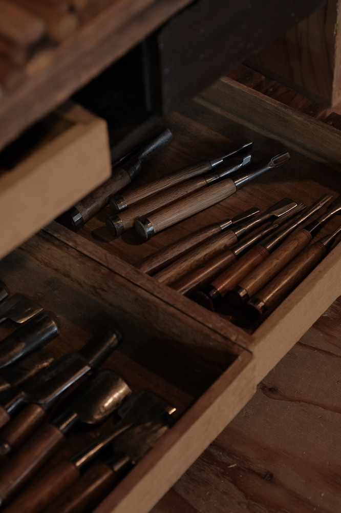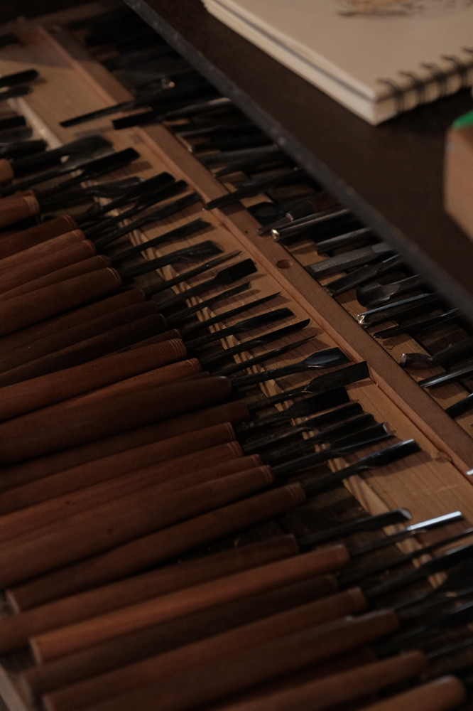 彫刻刀(ノミ)、そのほか手道具や電動工具。見える場所にあるだけでも彫刻刀(ノミ)はかなりの数。お聞きすると仕舞ってあるものを含めると彫刻のための刃物類は300本以上はあるということだった。刃の幅、厚み、角度など、すべてが微妙に異なり、それを使い分ける。必要なサイズや仕様のものはもうほとんど揃っているが、それでもいまだに少し買い足すこともあるという。